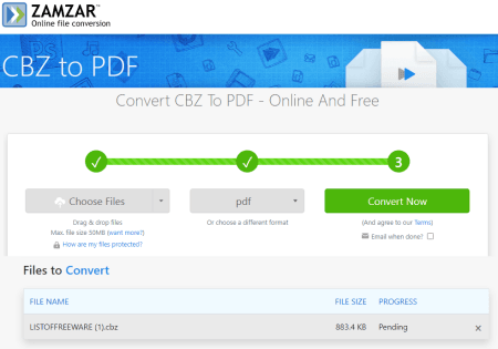 Zamzar เป็นอีกหนึ่งเว็บไซต์ฟรีที่คุณ สามารถใช้สำหรับการแปลง CBZ เป็น PDF ออนไลน์ มันมีตัวแปลงง่าย ๆ ที่คุณสามารถเพิ่มไฟล์ CBZ ของคุณและแปลงเป็น PDF รองรับการนำเข้าคลาวด์ที่มี Google Drive, Dropbox, OneDrive และ Box อย่างไรก็ตาม คุณสามารถเพิ่มไฟล์ได้สูงสุด 2 ไฟล์ต่อการแปลงโดยจำกัดขนาดการแปลงสูงสุดที่ 50 MB ด้วยวิธีนี้ คุณสามารถทำการแปลงแล้วรับไฟล์ PDF ในเอาต์พุต โปรดทราบว่าตัวแปลงนี้ให้คุณแปลงไฟล์ 2 ไฟล์ต่อวันได้ฟรี