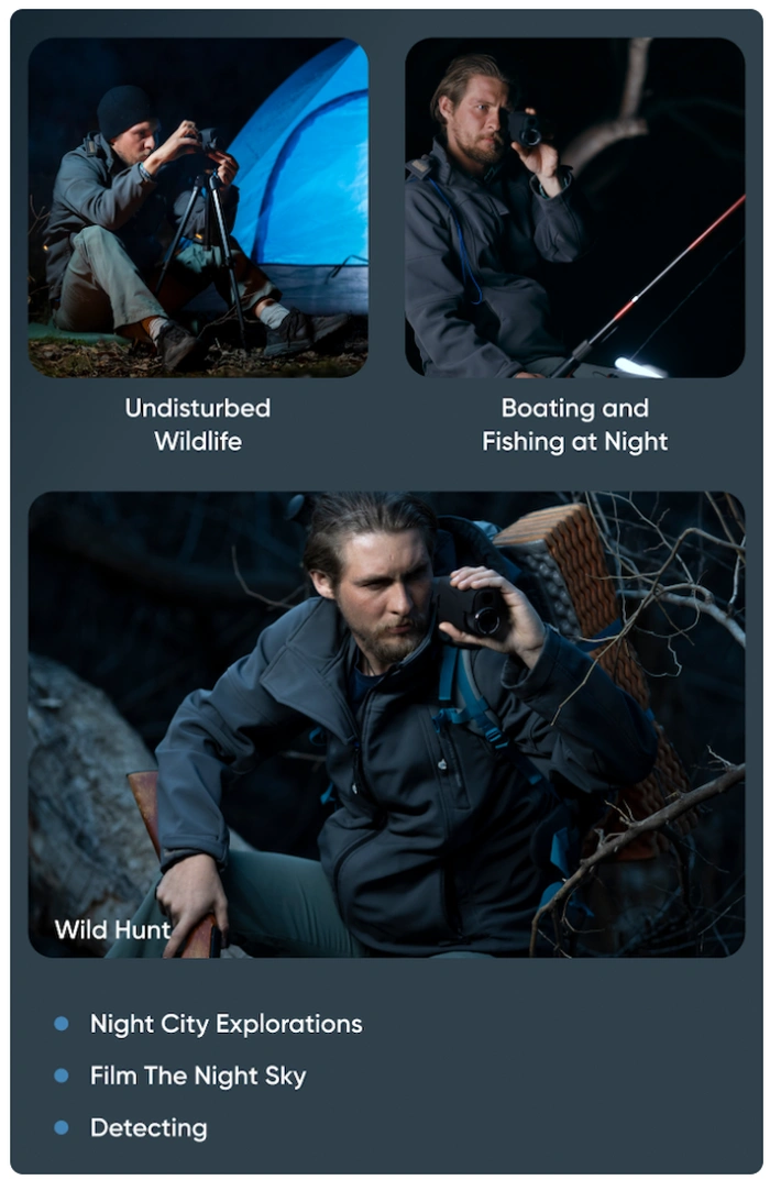 “ไม่พลาดโอกาสอีกต่อไปเมื่อเป้าหมายของคุณอยู่ไกลเกินไปและมืดมนยิ่งกว่าสีดำ โหมด IR ในตัว 7 โหมดบนไฟส่อง IR 850NM ช่วยเพิ่มปริมาณแสงเพื่อให้มองเห็นได้ชัดเจนยิ่งขึ้นในความมืดสนิท ตอนนี้แม้ในสภาวะที่มืดสนิท คุณก็สามารถมองเห็น’เป้าหมาย’ของคุณได้อย่างชัดเจนถึง 500 เมตร! การซูมแบบออปติคอล 5 เท่าและการซูมแบบดิจิตอล 10 เท่าอันน่าทึ่งที่จับคู่กับโหมดแมนวลโฟกัสช่วยให้คุณเข้าใกล้ได้แม้กระทั่งรายละเอียดเล็กๆ จากระยะ 0.5 เมตร หรือมองเห็นสิ่งที่อยู่ห่างออกไป 500 เมตร! บันทึกทุกรายละเอียดด้วยความชัดเจนที่น่าทึ่งเพื่อประสบการณ์การสำรวจยามค่ำคืนอันน่าทึ่งอย่างแท้จริง”