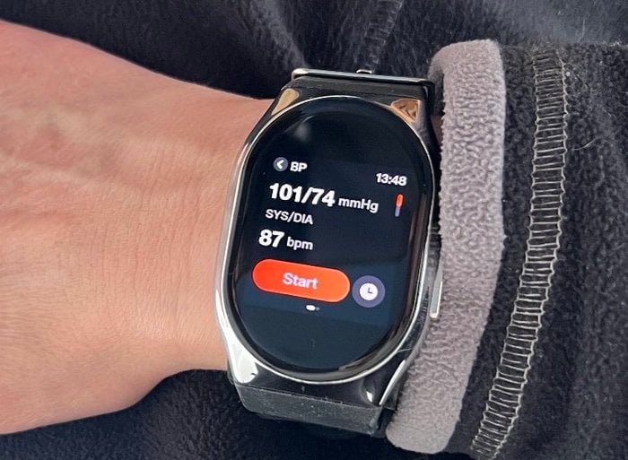 พวกเขาติดตั้งสมาร์ทวอทช์ความดันโลหิตพร้อมปุ่มหลักสองปุ่มที่ด้านขวาของหน้าปัดนาฬิกา โดยปุ่มที่เล็กกว่าช่วยให้เข้าถึงเวลาได้อย่างรวดเร็ว และปุ่มที่ใหญ่ขึ้นเพื่อ นาฬิกาติดตั้งแอปพลิเคชัน หน้าจอจะปิดโดยอัตโนมัติหลังจากผ่านไปหลายวินาทีตั้งแต่ 5 ถึง 20 วินาทีและสามารถตั้งค่าได้ภายในเมนูการตั้งค่า ช่วยให้คุณประหยัดพลังงานแบตเตอรี่สำหรับกิจกรรมการตรวจสอบที่สำคัญยิ่งขึ้น