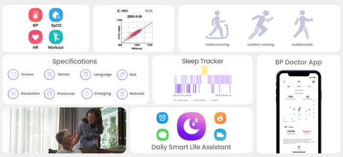 สมาร์ทวอทช์ YHE BP Doctor Pro ไม่เพียงตรวจสอบความดันโลหิตเท่านั้น แต่ยังสามารถอ่านของคุณ อัตราการเต้นของหัวใจ ความอิ่มตัวของออกซิเจนในเลือด SpO2 ความแปรปรวนของอัตราการเต้นของหัวใจ HRV และชีพจร ไม่เพียงแค่นั้น แต่ยังสามารถตรวจสอบคุณภาพการนอนหลับของคุณและติดตามการออกกำลังกายของคุณได้อีกด้วย มอบอุปกรณ์ติดตามฟิตเนสแบบสวมใส่ได้ในราคาย่อมเยาพร้อมฟีเจอร์ตรวจวัดความดันโลหิตที่ไม่เหมือนใคร