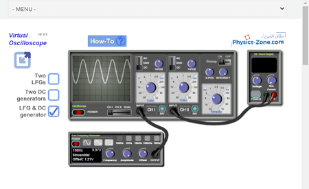 physics-zone.com เป็นบริการออนไลน์ของออสซิลโลสโคปเสมือนฟรี บริการนี้นำเสนอระบบออสซิลโลสโคปที่ปรับแต่งได้ ช่วยให้ผู้ใช้สามารถรักษาการกำหนดค่าออสซิลโลสโคปที่แตกต่างกันสามแบบ ได้แก่ ออสซิลโลสโคปและเครื่องกำเนิดความถี่ต่ำ 2 เครื่อง ออสซิลโลสโคปและเครื่องกำเนิดไฟฟ้ากระแสตรง 2 เครื่อง และ ออสซิลโลสโคปที่มี LFG หนึ่งเครื่องและเครื่องกำเนิดไฟฟ้ากระแสตรงหนึ่งเครื่อง ตามการกำหนดค่า ผู้ใช้สามารถสร้างสัญญาณและวิเคราะห์บนออสซิลโลสโคปได้ ตอนนี้ มาดูคุณสมบัติหลักของบริการออสซิลโลสโคปเสมือนนี้