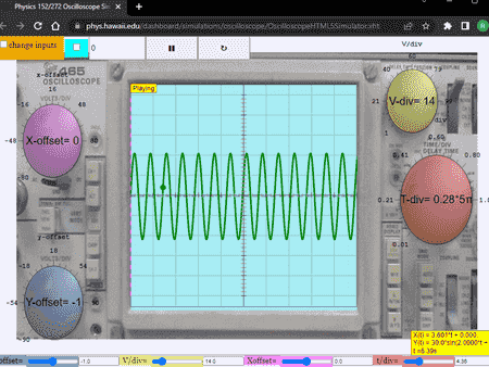 phys.hawii.edu เป็นอีกหนึ่งเสมือนฟรี บริการออสซิลโลสโคปออนไลน์ เว็บไซต์นี้มาพร้อมกับออสซิลโลสโคปเสมือนมาตรฐาน ผู้ใช้สามารถสั่งงานออสซิลโลสโคปนี้ด้วยตนเองเพื่อสร้าง แก้ไข และวิเคราะห์สัญญาณบนจอแสดงผลหลัก ตอนนี้ ตรวจสอบคุณสมบัติหลัก