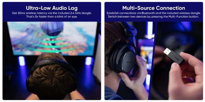 “คุณสมบัติใหม่ที่เพิ่มขึ้นนี้ใช้งานได้นาน 20 ชั่วโมง อายุการใช้งานยาวนานด้วย USB-C, การชาร์จด่วนที่ให้การชาร์จสูงสุด 2 ชั่วโมงใน 10 นาที, ส่วนต่อขยายไมโครโฟนแบบบูมที่ถอดออกได้ และความสามารถในการเชื่อมต่อหลายแหล่งที่รองรับทั้งระบบไร้สาย Bluetooth 5.2 และ 2.4 GHz ด้วยด็องเกิล USB 2.4 GHz ที่ให้มา Wyze กำลังโฆษณาว่ามีเวลาแฝงแบบไร้สายต่ำถึง 20 มิลลิวินาที”