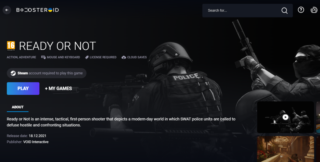 Boosteroid ขจัดความจำเป็นในการติดตั้งซอฟต์แวร์เพิ่มเติมเพื่อเล่น Ready or Not บน Mac ไม่จำเป็นต้องติดตั้งเกมในเครื่องด้วยเช่นกัน นั่นเป็นเหตุผลว่าทำไมจึงไม่ต้องกังวลว่า Mac ของคุณจะมีสเปคขั้นต่ำหรือพื้นที่จัดเก็บเพียงพอหรือไม่ สิ่งที่คุณต้องมีคือ Mac การเชื่อมต่ออินเทอร์เน็ตที่ใช้งานได้ และบัญชี Boosteroid เพื่อเข้าสู่โหมด Ready or Not คู่มือนี้อธิบายรายละเอียดวิธีการเข้าถึงเกมโดยใช้บริการเกมบนคลาวด์ Boosteroid และเล่น