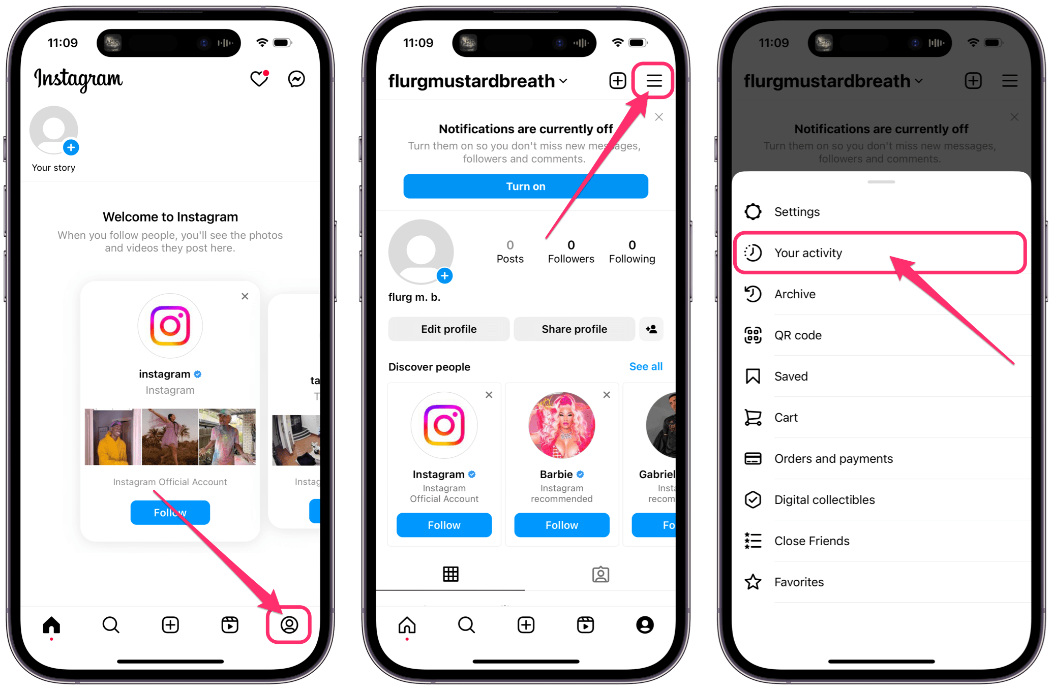 เปิด Instagramแข็งแกร่ง> แอพ แตะปุ่มโปรไฟล์ที่มุมขวาล่าง แตะปุ่มเมนูที่มุมขวาบน เลือก กิจกรรมของคุณ
