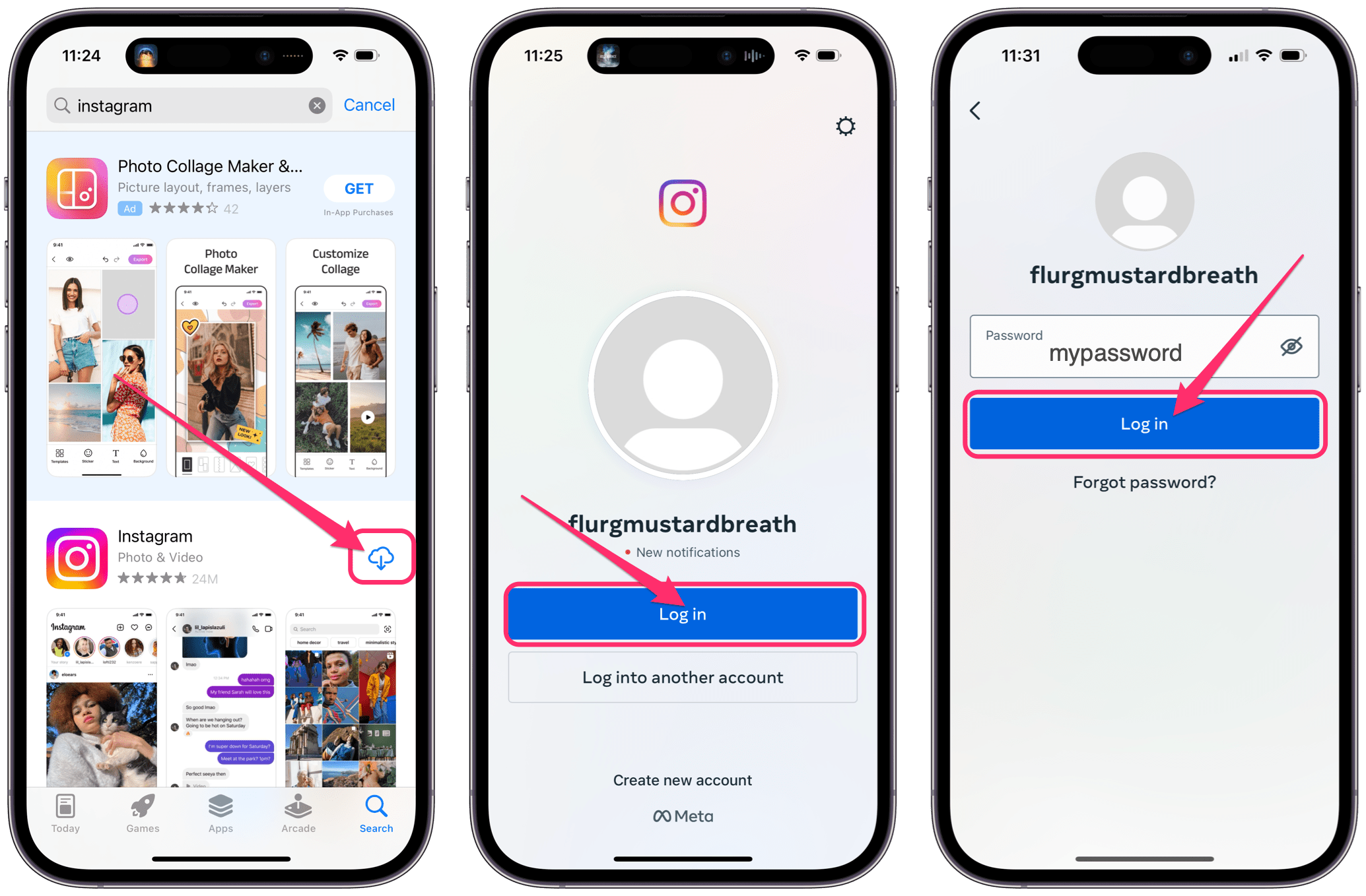 เปิด แอป App Store แล้วค้นหา Instagram แตะปุ่มคลาวด์ (ดาวน์โหลด) ถัดจาก Instagram เปิด Instagram แล้วแตะ เข้าสู่ระบบ ป้อนรหัสผ่านแล้วแตะ เข้าสู่ระบบ อีกครั้ง