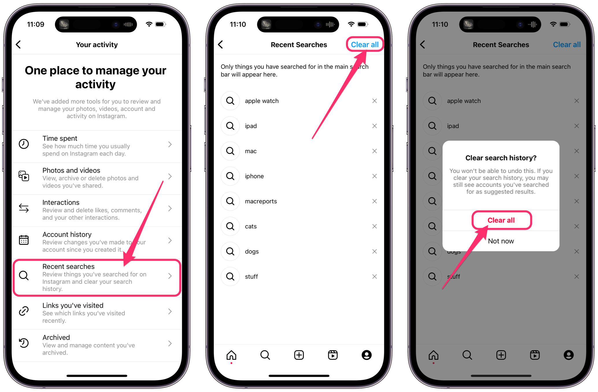 แตะที่ การค้นหาล่าสุด. แตะ ล้างทั้งหมด จากนั้นยืนยันโดยแตะล้างทั้งหมด อีกครั้ง