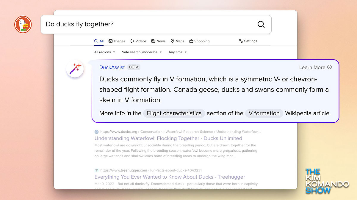 อ้างอิงจาก DuckDuckGo “หากคุณป้อนคำถามที่วิกิพีเดียสามารถตอบได้ลงในช่องค้นหาของเรา DuckAssist อาจปรากฏขึ้นและใช้เทคโนโลยีภาษาธรรมชาติของ AI เพื่อสร้างบทสรุปโดยย่อของสิ่งที่พบในวิกิพีเดียโดยไม่เปิดเผยตัวตน — อยู่เหนือผลการค้นหาส่วนตัวตามปกติของเรา”