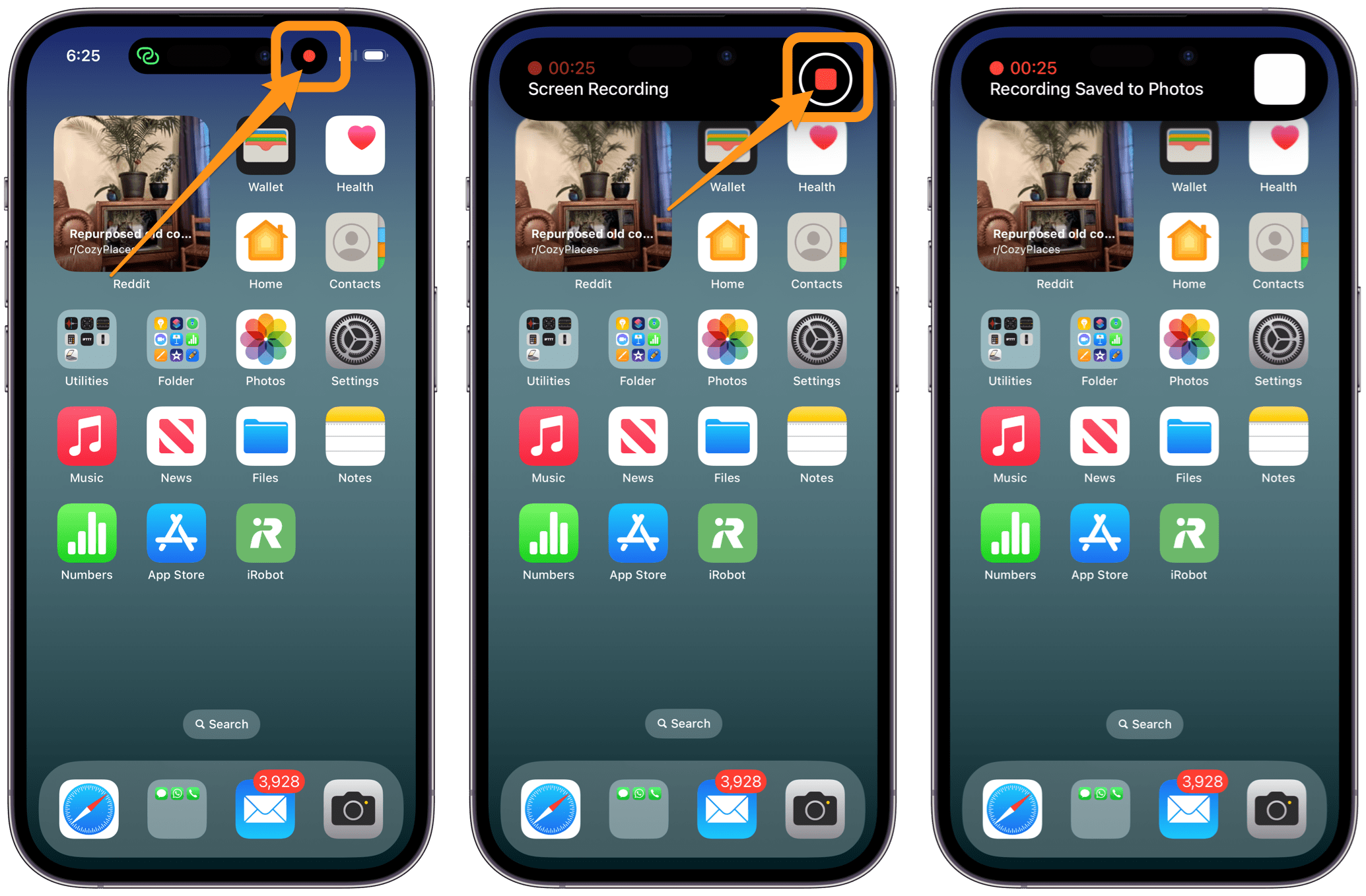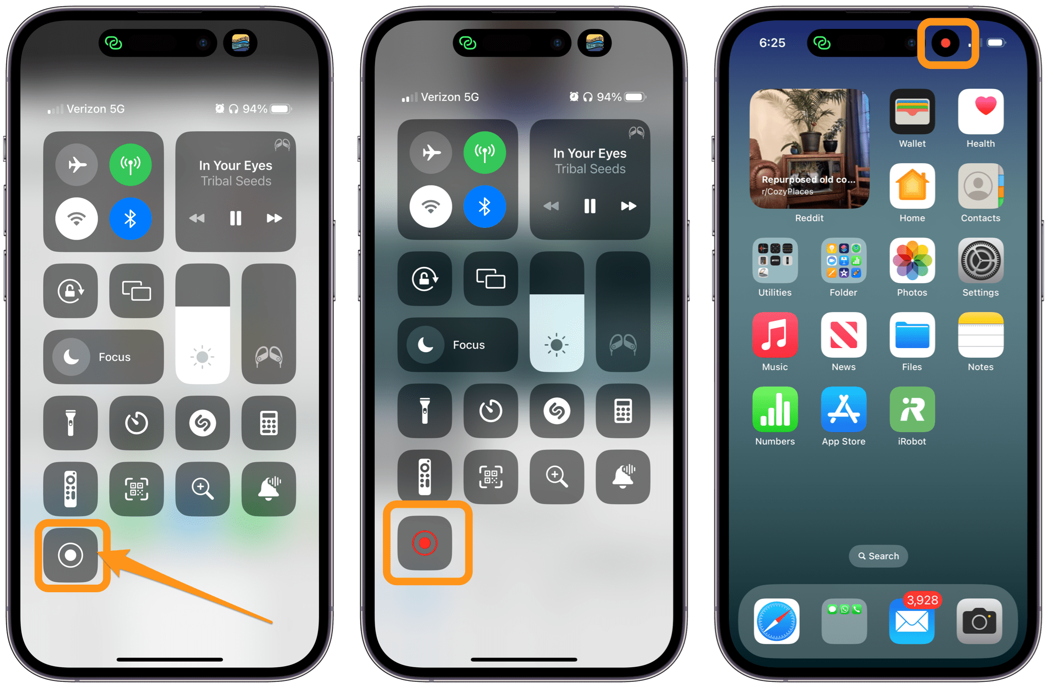 เปิด ศูนย์ควบคุม แตะปุ่มบันทึกหน้าจอ จะมีการนับถอยหลังสามวินาทีก่อนที่จะเริ่มการบันทึก หากคุณกำลังเล่นเสียงผ่าน iPhone (iPad) ควรบันทึกเสียงพร้อมกับหน้าจอ