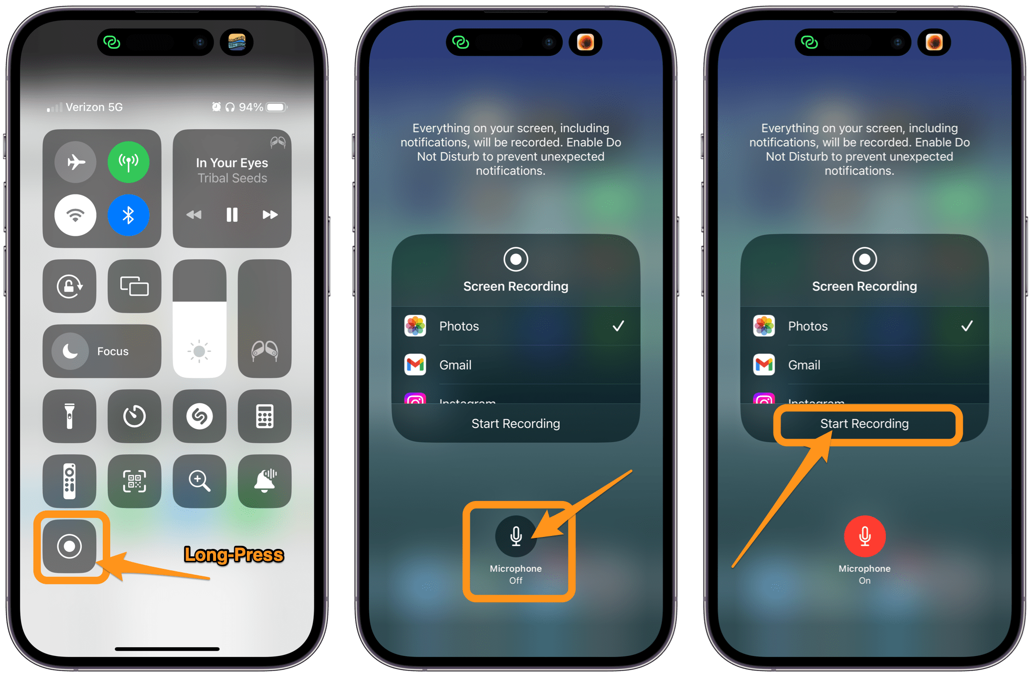 คุณยังสามารถเปิดหรือปิดไมโครโฟนเมื่อใดก็ได้ในขณะที่บันทึกหน้าจอ iPhone ของคุณ เพียงเปิด ศูนย์ควบคุม แล้วกดปุ่มการบันทึกหน้าจอค้างไว้ แล้วแตะปุ่ม ไมโครโฟน