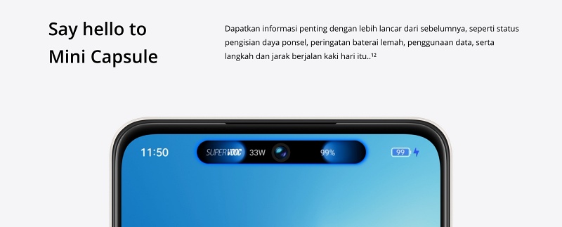 เรียกว่า Mini Capsule ฟีเจอร์ที่เหมือนเกาะไดนามิกบนโทรศัพท์ Realme C55 ขยายแถบของพื้นที่หน้าจอเกินกว่ากล้องเจาะรูตรงกลางเพื่อแสดงการแจ้งเตือน สถานะการชาร์จ และระดับแบตเตอรี่ Realme กล่าวว่ามีแผนที่จะอัปเดตคุณสมบัติ Mini Capsule เพื่อแสดงขั้นตอนและการใช้ข้อมูลในอนาคต