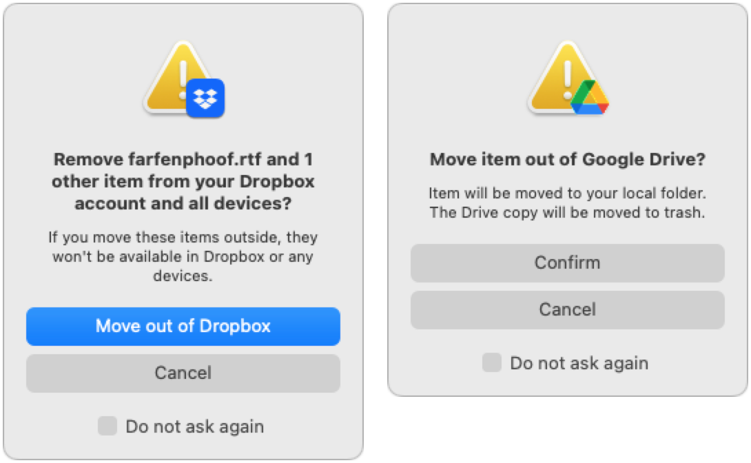 นั่นคือการเปลี่ยนแปลงที่สำคัญเนื่องจาก นอกจากนี้ บริการต่างๆ ยังต้องรักษาสำเนาออนไลน์ของไฟล์ ดังนั้นอย่างน้อย Dropbox และ Google Drive จึงแปลความหมายว่าการย้ายไฟล์ไปยังโฟลเดอร์อื่นใน Finder เป็นการลบเวอร์ชันออนไลน์ โดยวางไฟล์ที่ย้ายนั้นในถังขยะออนไลน์ของบริการ ทั้งยังแจ้งเตือนคุณถึงสิ่งที่เกิดขึ้น และคุณสามารถปิดการแจ้งเตือนได้