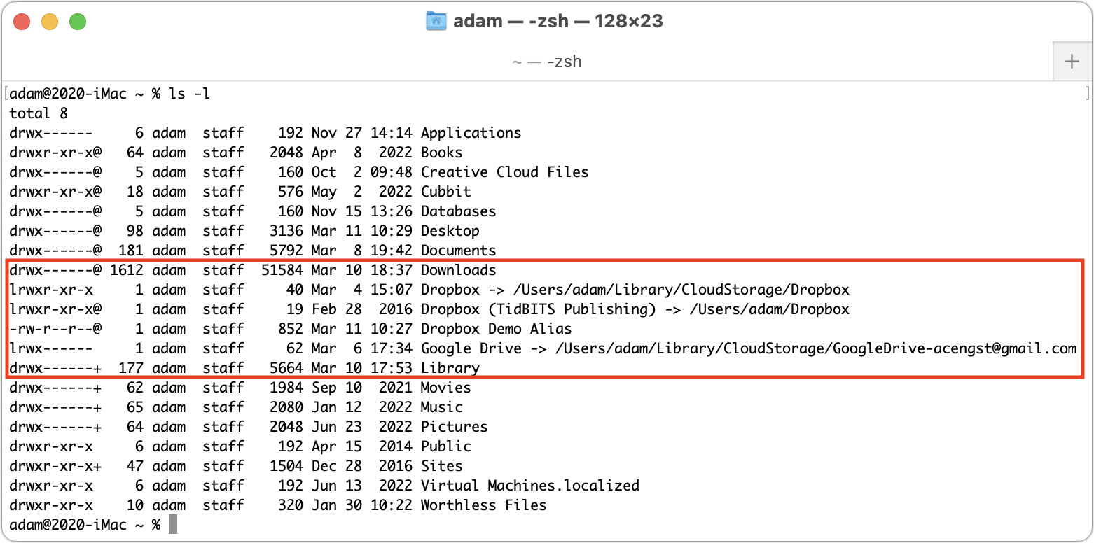 ระบบคลาวด์ บริการจัดเก็บข้อมูลทำให้น้ำขุ่นมัวด้วยการสร้างสิ่งที่ดูเหมือนนามแฝง (จริงๆ คือ symlink) ในตำแหน่งเดิมเพื่อรักษาความต่อเนื่องสำหรับผู้ใช้ แต่โฟลเดอร์ Dropbox นั้นในโฮมโฟลเดอร์ของคุณเป็น symlink หรือโฟลเดอร์ในเครื่องที่ขาดการเชื่อมต่อหรือไม่ ตรวจสอบโดยเปิด Terminal แล้วพิมพ์ ls-l (หากคุณไม่ได้อยู่ในโฮมโฟลเดอร์ ให้ใช้คำสั่ง cd ก่อน) ดังที่คุณเห็นด้านล่าง ตอนนี้ฉันมี symlink ของโฟลเดอร์ Dropbox และ Google Drive ในโฟลเดอร์เริ่มต้นของฉัน สังเกตว่า symlinks มี l ในคอลัมน์ซ้ายสุด ในขณะที่ไดเร็กทอรีอย่าง Downloads และ Library ขึ้นต้นด้วย d และ Dropbox Demo Alias ที่ฉันสร้างเพื่อเป็นภาพประกอบมี-.