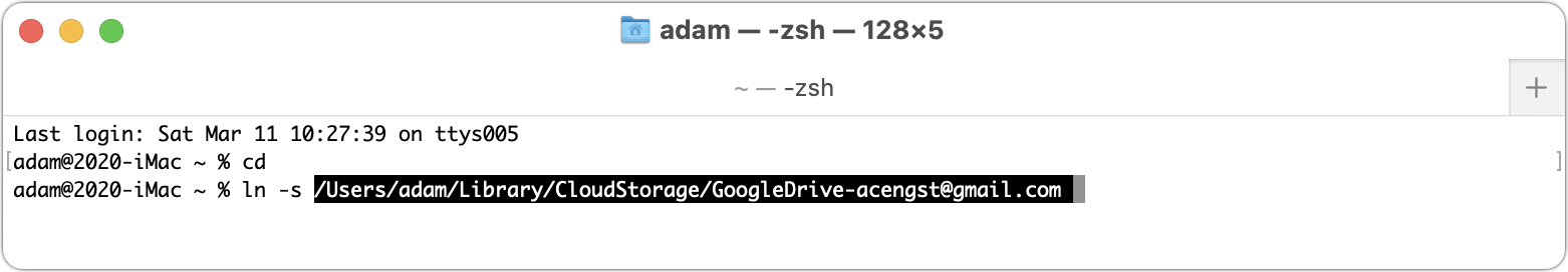 ลากโฟลเดอร์บริการพื้นที่เก็บข้อมูลบนคลาวด์ เช่น Dropbox หรือ Google Drive จาก Finder ไปยังหน้าต่าง Terminal เพื่อแทรกเส้นทาง วิธีการนี้จำเป็นเพราะอย่างน้อย Google Drive ก็มีชื่อที่แตกต่างจากที่คุณเห็น กด Return เพื่อสร้าง symlink