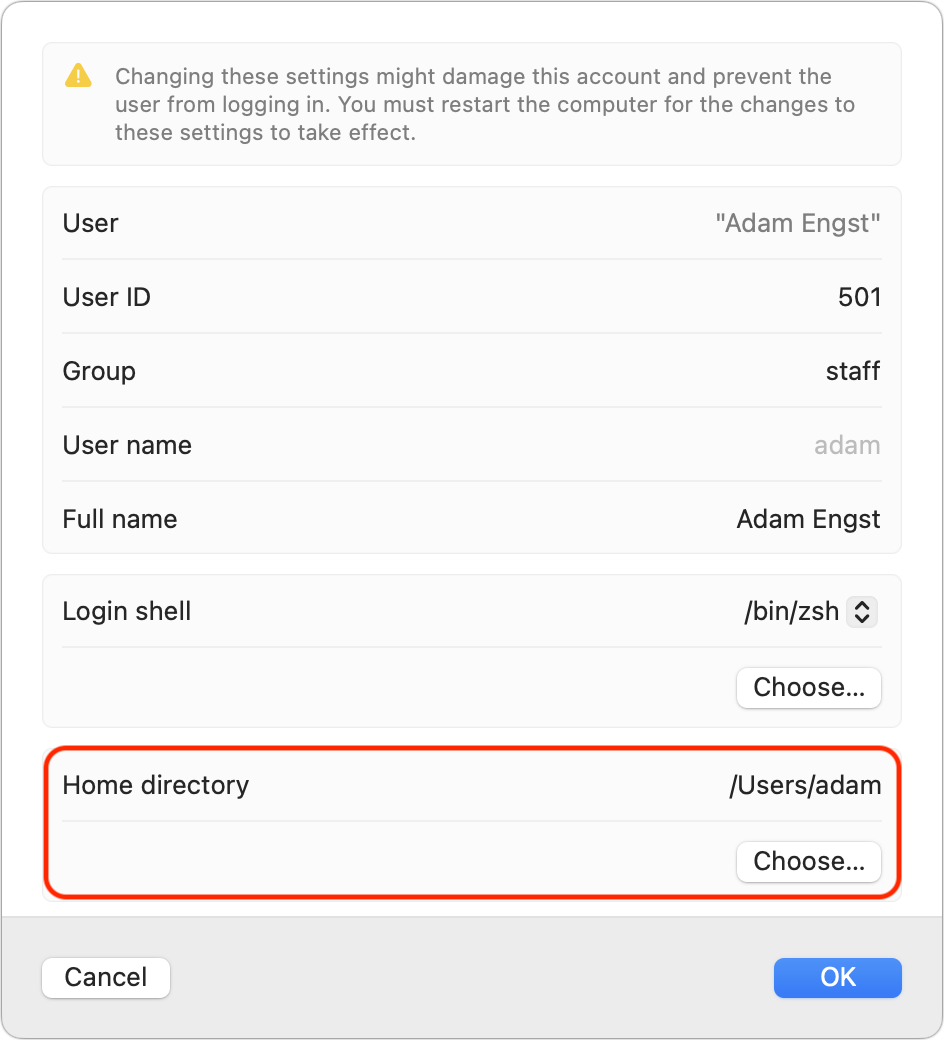 อาจมีวิธีแก้ปัญหาอื่น ซึ่งก็คือ ย้ายตำแหน่งโฟลเดอร์เริ่มต้นทั้งหมดของคุณไปยังไดรฟ์ภายนอก กด Control แล้วคลิกที่ผู้ใช้ใน System Settings/Preferences > Users & Groups เพื่อเข้าถึงฟิลด์ Home Directory อย่าแม้แต่คิดที่จะทำเช่นนี้ แม้จะใช้บัญชีทดสอบก็ตาม เว้นแต่คุณจะเชี่ยวชาญด้านเทคนิคและได้ทำการสำรองข้อมูลหลายรายการก่อน